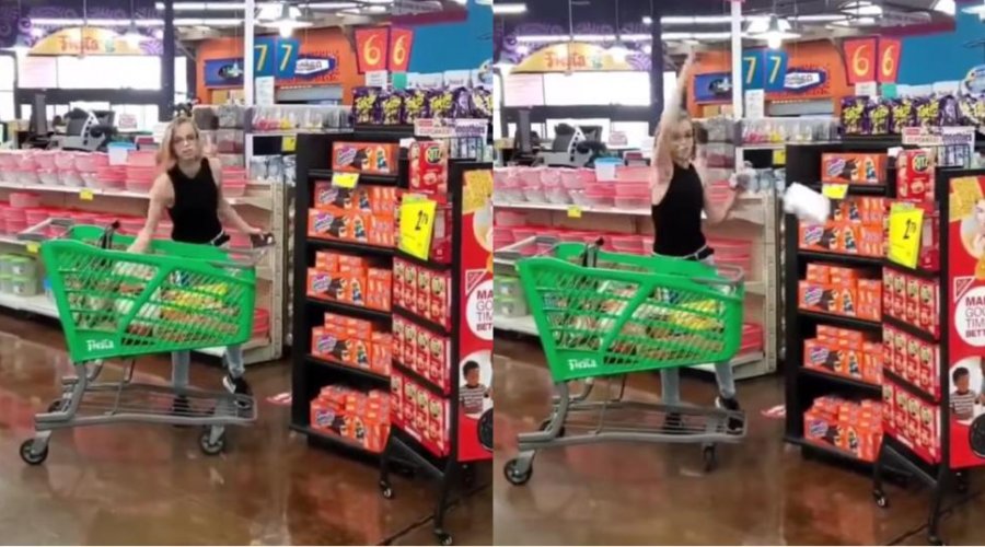 Uma mulher que fazia compras em um supermercado de Dallas, nos Estados Unidos, teve uma reação surpreendente ao ser questionada por não utilizar máscara de proteção no estabelecimento. A moça, que não teve a identidade revelada, se recusou a colocar o equipamento de proteção individual que auxilia na contenção da propagação do novo coronavírus enquanto se dirigia ao caixa para realizar o pagamento.